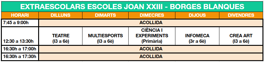 | Acollida matí: 7:45 – 9:00h | 42€/fix 4,20€/puntual |