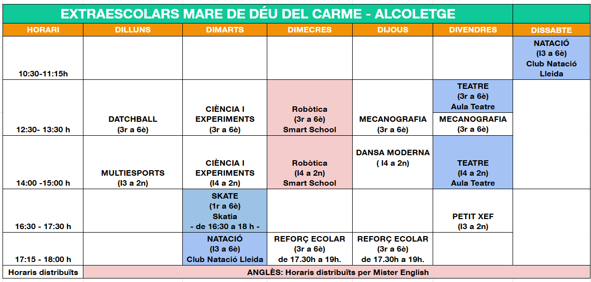 - Oferta d'activitats extraescolar de l'Escola Mare de Déu del Carme – Alcoletge