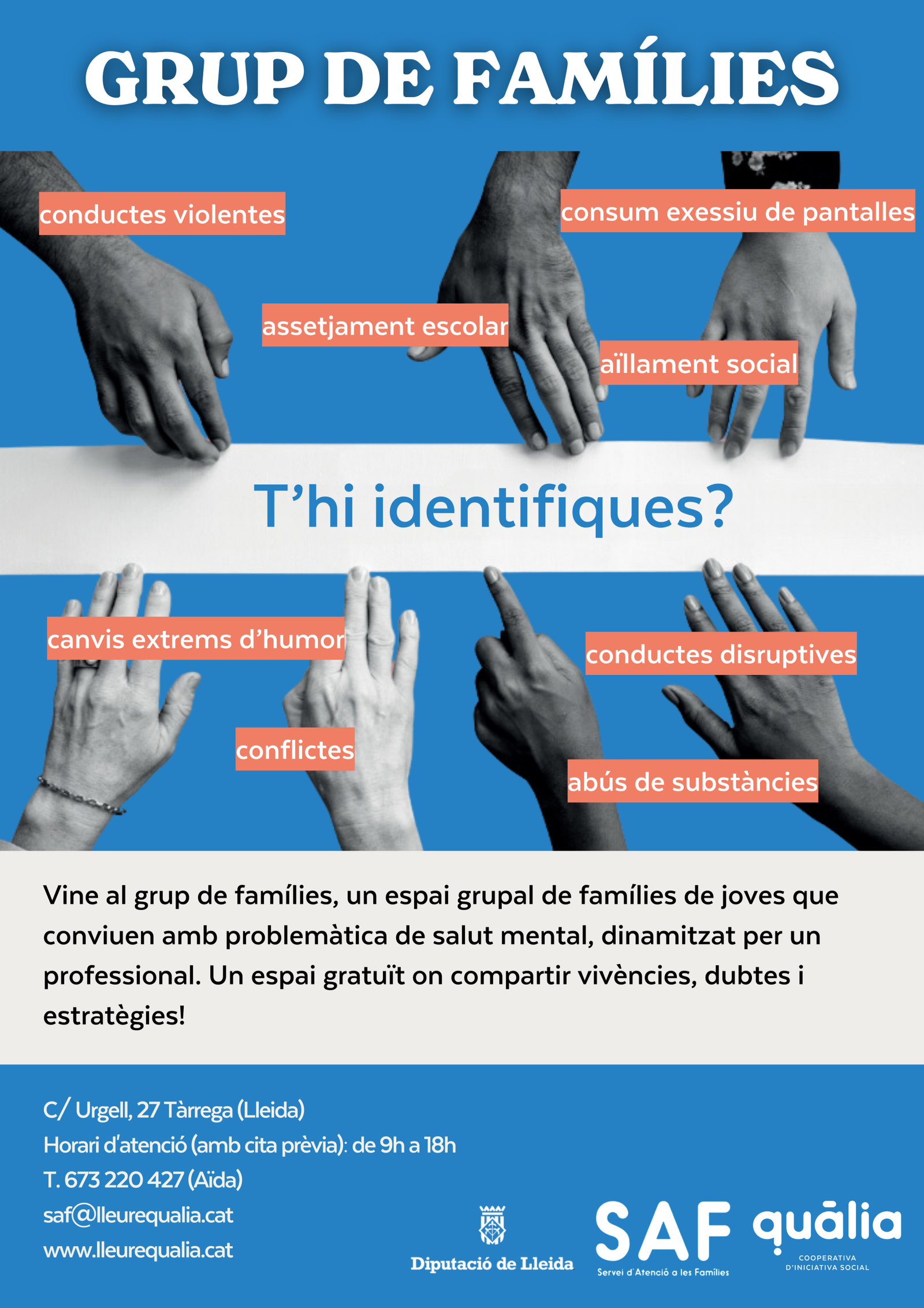 Si tens algun dubte o vols més informació sobre la salut mental, contacta amb nosaltres a través del correu: saf@lleurequalia.cat o a través del telèfon 67322042